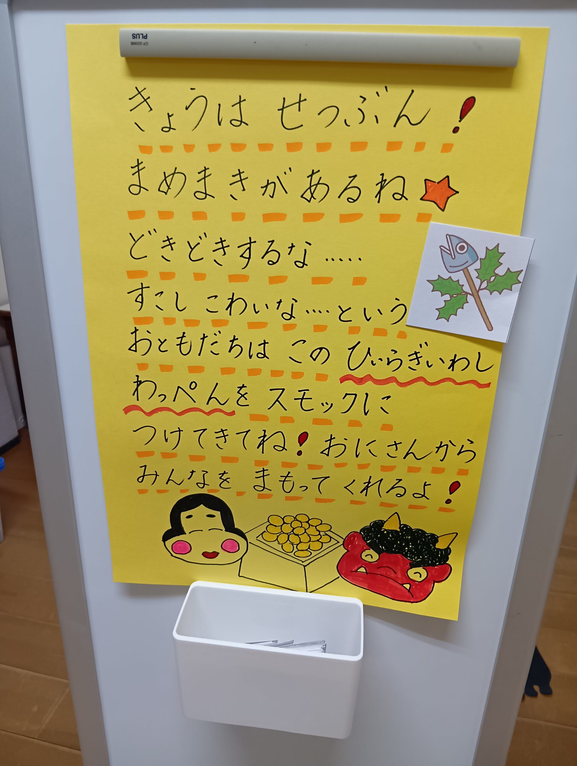 おにさんがこわいおともだちはこのバッチをつけるようです。きのうまでいらないよと言っていた子も、3つつけていました。