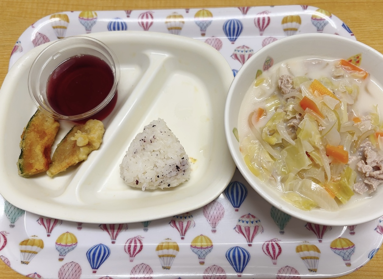 本日の給食 作成者 webss公開日 2025年10月8日2025年10月8日本日の給食 にコメントを残す *ちゃんぽん *ミニゆかりごはん *かぼちゃの天ぷら *ぶどうゼリー 本日の給食は、子どもたちに人気の「ちゃんぽん」でした🍜 野菜がたっぷり入ったあたたかいスープに、つるつる麺がよく合います。 ミニゆかりごはんや、ほくほく甘いかぼちゃの天ぷらや、デザートのぶどうゼリーも残さず食べてくれていました♩