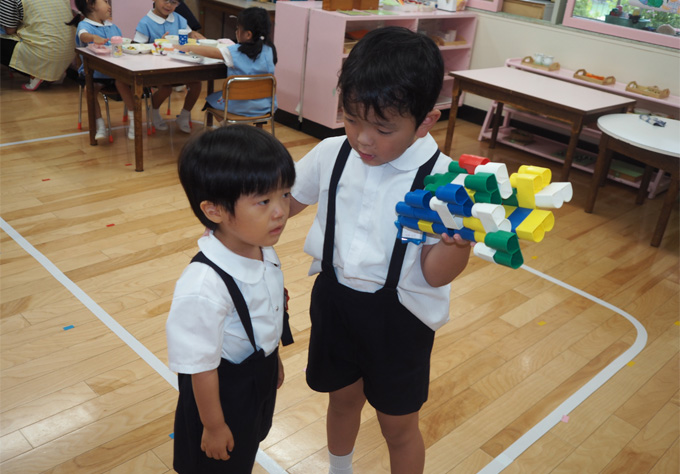 年齢が異なるので、自然のうちに、年長児は年少児に対して愛情、いたわり、思いやりの心をもって親切に教え、手助けし、これによって自分自身をより豊かに充実させます。