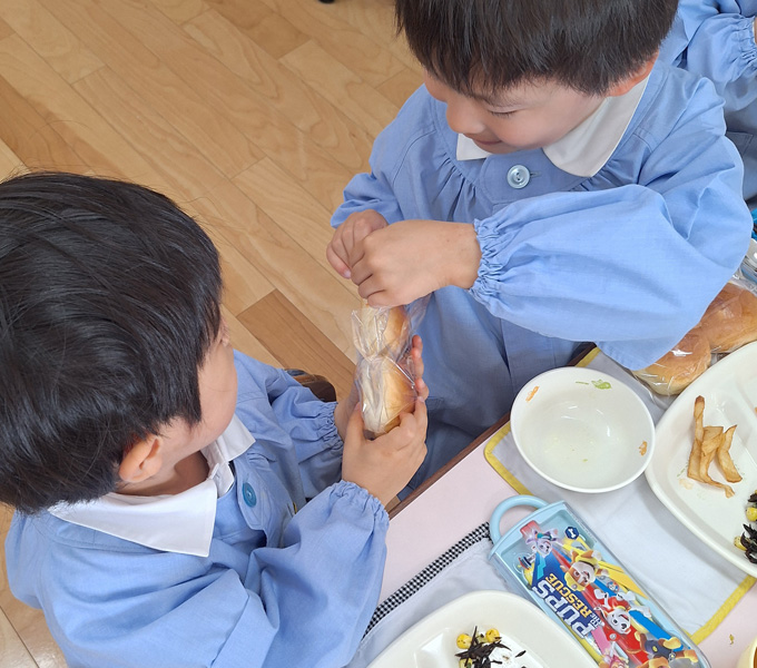 本園の教育目標をより的確に達成できるようにとの意向で、年齢の違う子どもが同じクラスで生活します。大きい子どもが小さい子どもを手伝ってあげたり、小さい子どもは、大きい子どものすることを見て真似し、尊敬と憧れを持ちます。このように家庭的雰囲気の中で生活することによって、円満な人格を形成していくことを目指しています。