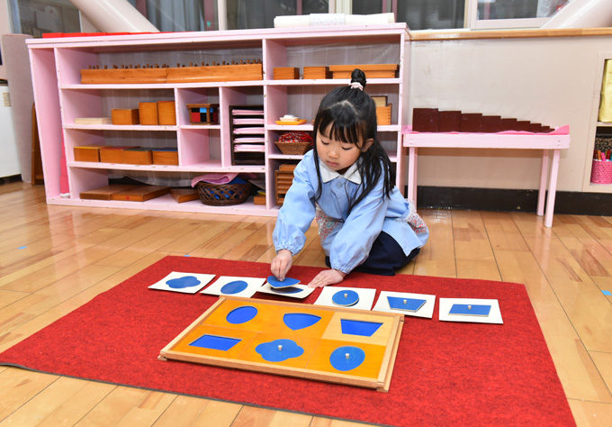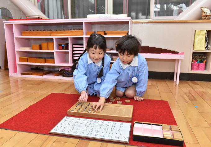 教育内容は、日常生活の練習、感覚教育、言語教育、数教育、文化、または一般の諸領域にわたって、子どもたちが自発的に学べるように、保育室に教材を整え、各コーナーを設けています。そこで教師は、大人の考えで外側から教え込んだり、押し付けたりするのではなく、子どもの中にすでに自然に備えられている大きな力(成長発達を促す原動力=生命)を大切にし、それに従って子どもが自ら成長して行けるように手助けします。